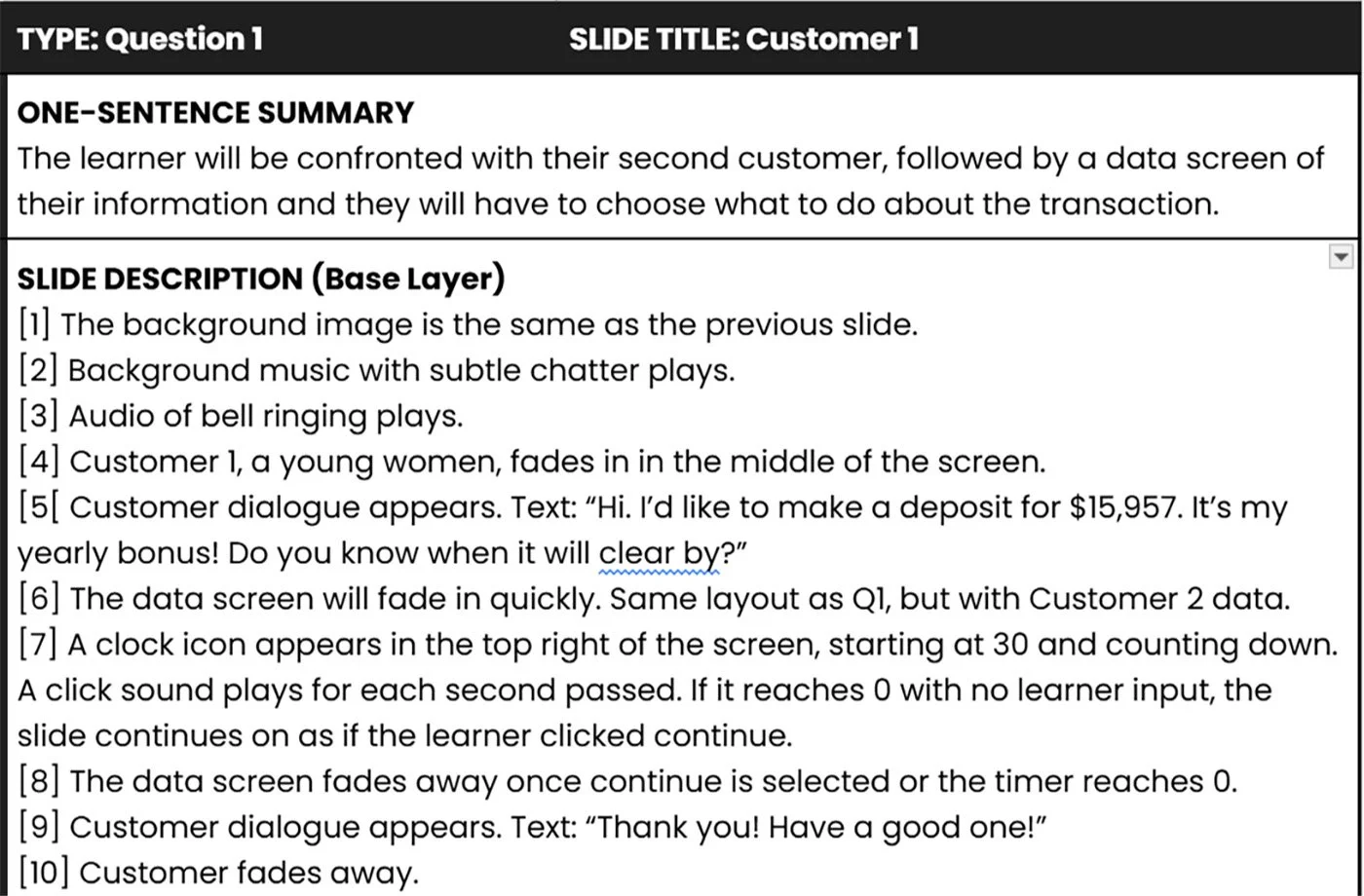 I built out a text-based storyboard that organized the main structure and flow of the project. This included descriptions of the slides, what components would be built and how. Doing this allowed me to streamline my understanding of how the project would play out, without having to spend a large amount of time building it in an authoring tool. I followed Mayer’s Personalization Principle by writing conversational language when appropriate, while maintaining the professional corporate jargon on forms and documents.