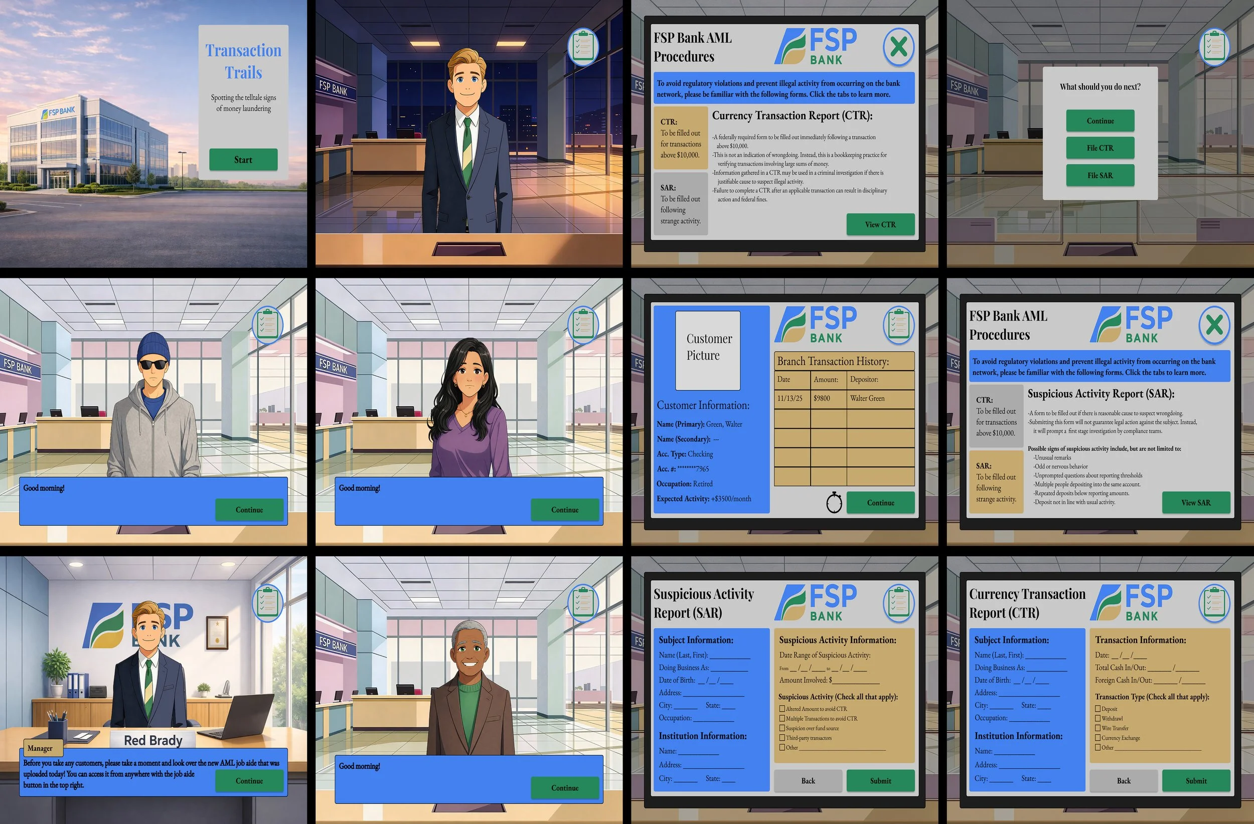This scenario-based eLearning simulation is a concept project designed to help bank tellers identify unusual activities in day-to-day transactions and accurately file the appropriate reports.