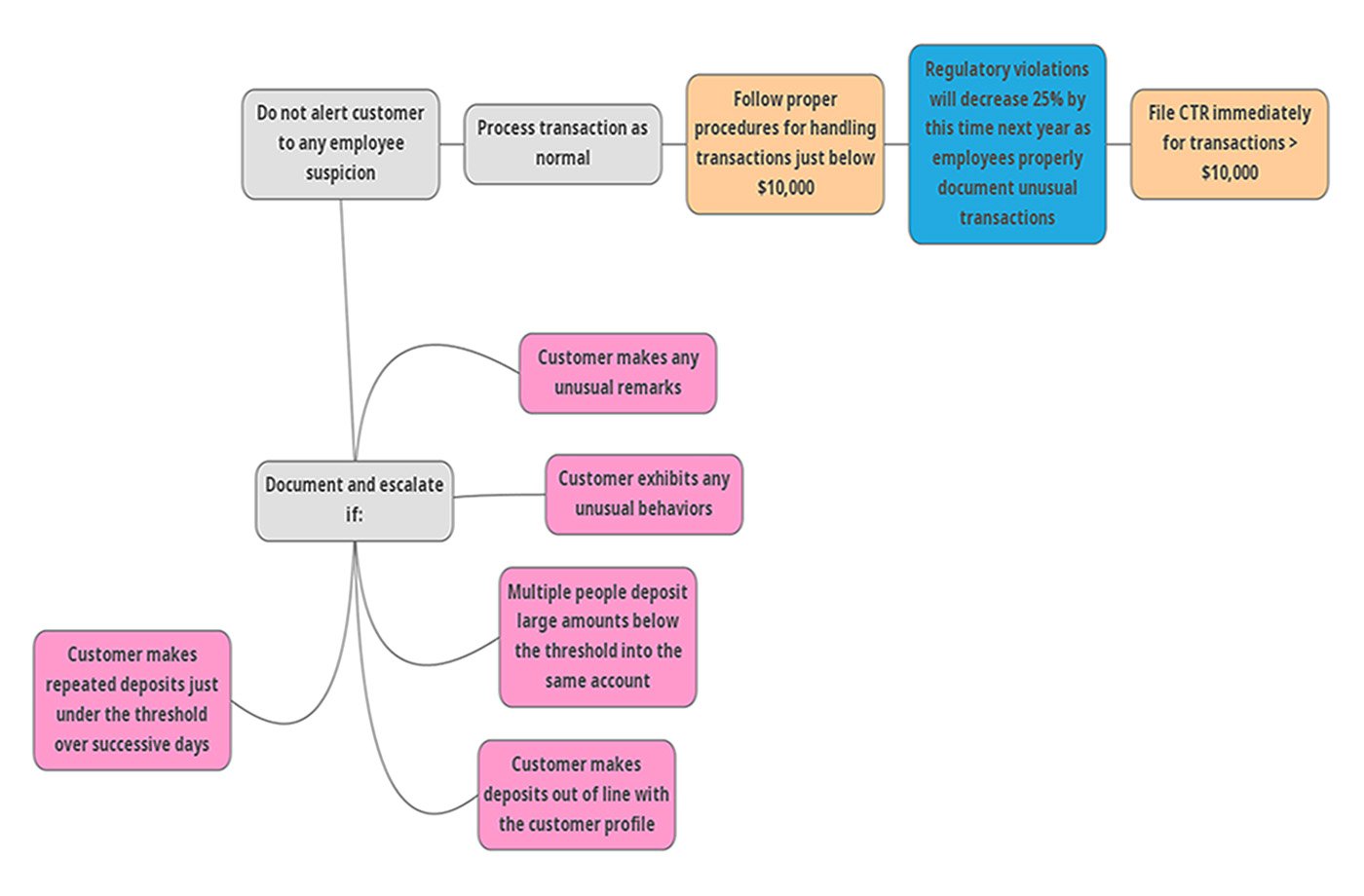 What I discovered was that employees were largely unaware of the signs of unusual activity, and what paperwork to file when they encountered such a situation. My goal was to help employees recognize the common data patterns and human behaviors that accompany money laundering, and choose the correct reports to file.