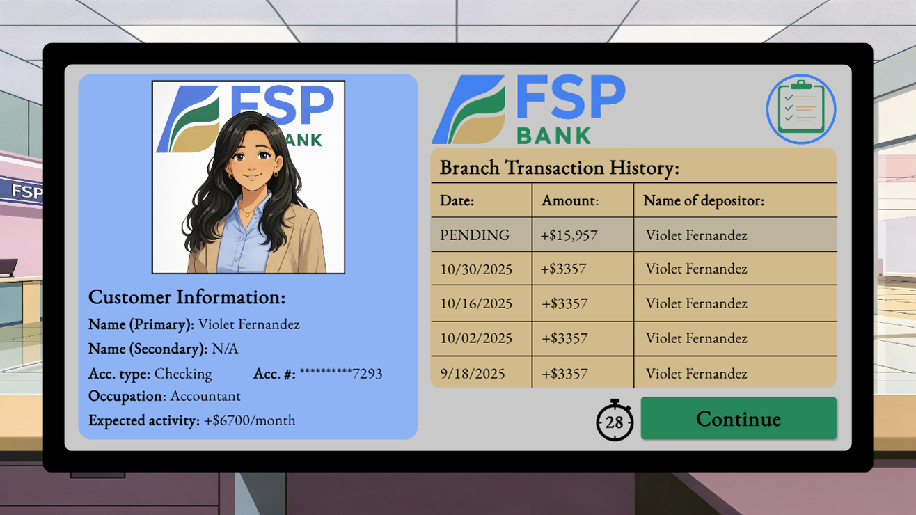 Filling out forms: The primary goal of this simulation is to teach the learners about how to recognize the important signs of money laundering, and select the proper forms to fill out based on the patterns they recognize. In order to limit cognitive load, the simulation automatically fills out the report forms for the learner. This reduces the amount of new information the learner needs to process and apply at one time. In a subsequent project, requiring the learner to fill out the forms on their own would further increase realism and evaluate whether they are not only going to the right forms, but properly documenting the unusual patterns they observed.