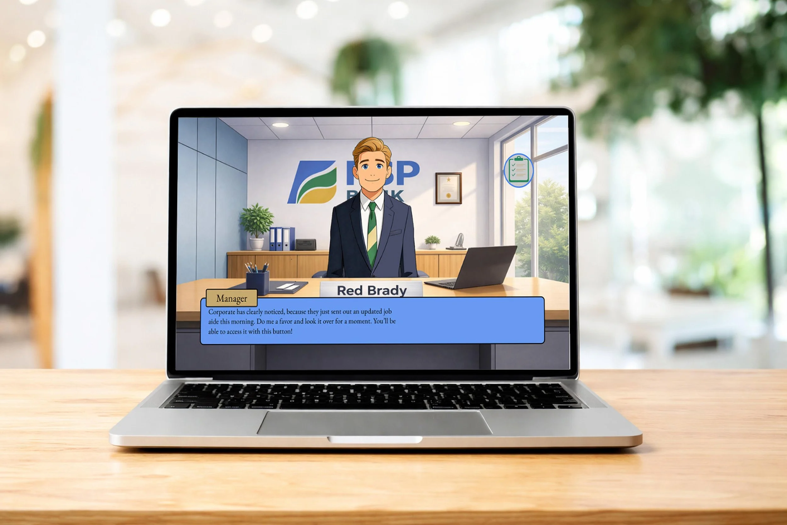 I started the visual design process by creating a style guide which centralized the information that I would draw from when making design decisions. In order to build coherent and balanced interfaces, I organized the structure of the slides with wireframes. Then I brought the slides to life by using the predefined colors from the style guide to make each slide visually coherent. I used AI-generated backgrounds and characters in order to accelerate the timeline on which I could begin working on an initial prototype. Mayer’s Embodiment Principle states that learners retain more information when it is presented in a human-like manner, so I decided to have most of the feedback come from the bank’s manager.